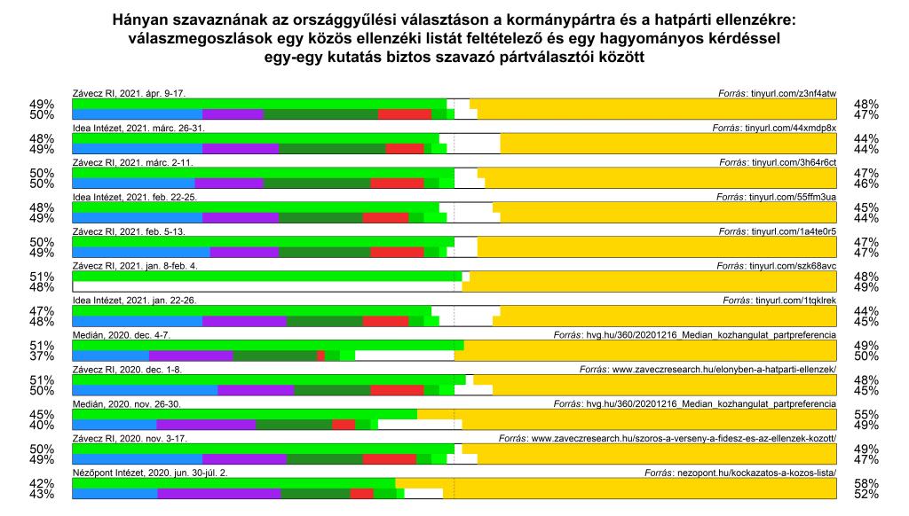 A nehézség az, hogy ezt a perdöntő százalékot meglepően nagy bizonytalansággal lehet csak kibányászni a közvélemény-kutatásokból. Az ok a különböző intézetek mérései közti különbségek nagysága. Az alábbi ábra eltérő színekkel különbözteti meg egymástól az egyes közvéleménykutatók adatait, és mindegyiktől csak azt mutatja meg, hogy egy adott mérés során mekkora volt a közös indulást tervező ellenzéki pártok előnye a kormánypárttal szemben. Így szabad szemmel is jól láthatjuk, hogy az IDEA, a Publicus, de kisebb mértékben a Republikon és a Závecz is, az átlagosnál ellenzéki szempontból általában kedvezőbb, a Medián, a Nézőpont és a Századvég viszont kedvezőlenebb eredményekről szokott beszámolni.