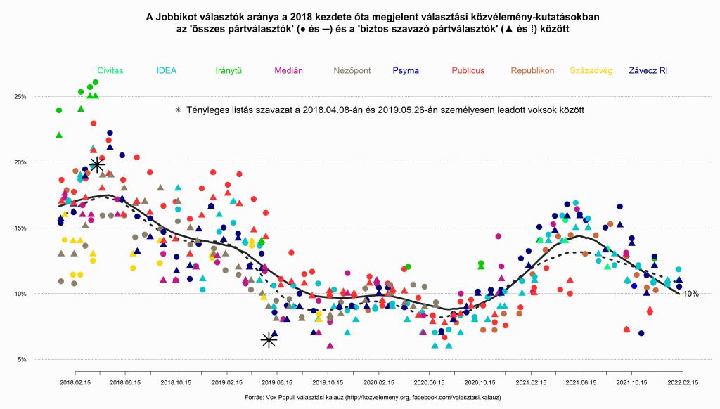 A Jobbik adataiban szerények az intézetközi különbségek azóta, hogy az Iránytű ritkán publikál, a Nézőpont és a Századvég pedig teljesen felhagyott az egyes ellenzéki pártokra vonatkozó számok közlésével. A 2018-as választást követő tízegynéhány hónapban harmadára csökkent a párt támogatottsága, amit a közkérdezések adatai nem is tudtak teljes mértékben megragadni. Tavaly szeptember óta azonban 7-8% tájáról 15% felé kapaszkodott vissza a párt támogatottsága, amit kézenfekvő volt Jakab Péter személyes parlamenti fellépéseivel és Facebook kampányával magyarázni. 2021 nyara óta viszont az összes megkérdezett között erősen visszaesett a párt, még ha 2020 nyarához képest látszik is még némi előrelépés.