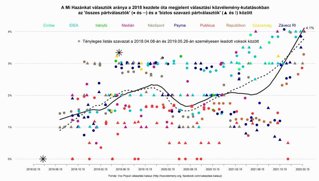 A két nagy blokktól függetlenül induló MKKP (Magyar Kétfarkú Kutya Párt) és Mi Hazánk közvélemény-kutatási adatai is elég szisztematikus intézet-közi különbségeket mutatnak. Bár az ok nem világos, politikai motivációt itt csak nagy képzelőerővel lehetne az eltérő adatok mögé képzelni. Feltűnő viszont, hogy a Nézőpontnál és a Mediánnál is akkortájt nőtt különösen nagyra az MKKP-t támogatók aránya, amikor a személyes kérdezésről áttértek a telefonosra. Meglehet, kisebb arányban tárcsáznak vezetékes számokat, mint a Publicus Intézet, és a Mediánról azt is tudjuk, hogy ők a Publicus-szal ellentétben felsorolják a választható pártok listáját, ha a megkérdezett nem mondja be kapásból, hogy melyik pártra szavazna, és ennek nyomán is ellentétes irányban változik a Kutyapárt aránya a különböző intézeteknél. Hasonlóképpen a Závecz 2021 október és november végi – személyes kérdezéssel végzett – omnibusz vizsgálatához képest a 2021 november eleji telefonos vizsgálatuk érzékelhetően erősebb MKKP-t és Mi Hazánkot talált.