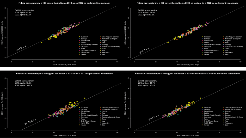 FRISS (2025. május 19): A 2022-es választás eredményei is azt igazolták, hogy az egyéni választőkerületek eredményei elég jól előrejelezhetők akkor, ha tudjuk, hogy a legutóbbi választás óta mennyit változott a különböző pártok országos népszerűsége. Az alábbi négy paneles ábra azt mutatja be, hogy mennyire volt megjósolható a 2022-es egyéni kerületi eredménye a Fidesznek illetve a hatpárti közös ellenzéki jelölteknek ugyanazon választókerületek 2018-as szavazatarányai illetve a 2019-es európai választáson leadott listás szavazatarányok alapján. Mint jól látható, a 2019-es listás adatok valamivel jobb előrejelzést adtak, mint a 2018-as egyéni kerületiek, de mindkettő alapján könnyen belátható, hogy a különböző egyéni kerületek népességének politikai ízlése közti különbségek meglehetősen állandóak választásról választásra. Hiába, hogy 2018-ban és 2019-ben külön-külön indult a hat ellenzéki párt, 2022-ben meg együtt, hiába omlott össze a 2018-as választás után a Jobbik és az LMP támogatottsága, és erősödött meg a DK és a Momentum, 2022-ben nagyjából ugyanakkora különbségek voltak egyik és másik választókerület között a Fidesz illetve a hatpárti ellenzék támogatottságában, mint 2018-ban vagy 2019-ben az európai parlamenti listás választáson. Elég azt tudni, hogy milyen eredmény született egy adott kerületben a közelmúltban, és hogy országosan mekkora volt a pártok népszerűségének a változása azóta, és már nagyjából tudjuk is, hogy melyik egyéni kerületben milyen eredményre lehet számítani.