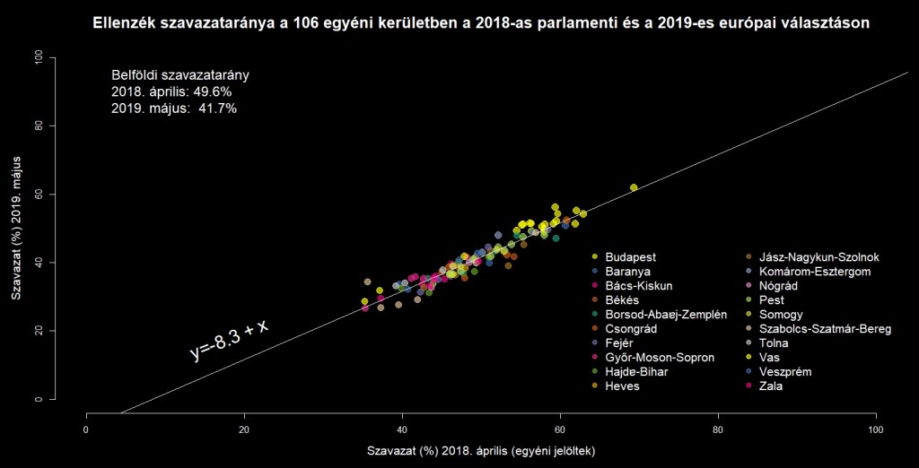 Amint a következő ábra mutatja, az egyesült ellenzék szavazataira is majdnem teljesen igaz egy hasonló összefüggés. Vonjunk ki 8,3%-ot az összes ellenzéki jelölt együttes szavazatarányából minden egyéni választókerületben, és meglehetősen pontosan megkapjuk, hogy a DK, a Momentum, az MSZP-P, a Jobbik és az LMP listája összesen mennyi szavazatot kapott ugyanott egy évvel később az Európai Parlament választásán. A naiv extrapolálás persze téved egy kicsit: annak alapján azt gondolhatnánk, hogy kettővel több egyéni választókerületben múlta felül 2019-ben a Fidesz-KDNP szavazataránya az ellenzéki kombóét, mint ahogy az a valóságban történt. De ez nem tűnik vállalhatatlanul drámai torzításnak, a fent javasolt módszer a jelek szerint tehát működik, és viszonylag jól előre jelezhetjük vele, hogy vajon hány választókerületben kerül többségbe a Fidesz illetve az egyesült ellenzék, ha kicsit (vagy nem is olyan kicsit) másként alakul az országos népszerűsége, mint a legutóbbi országos választás idején.
