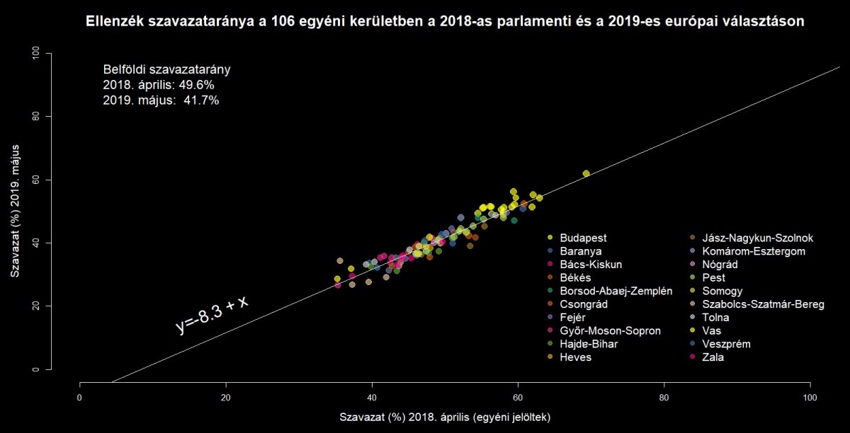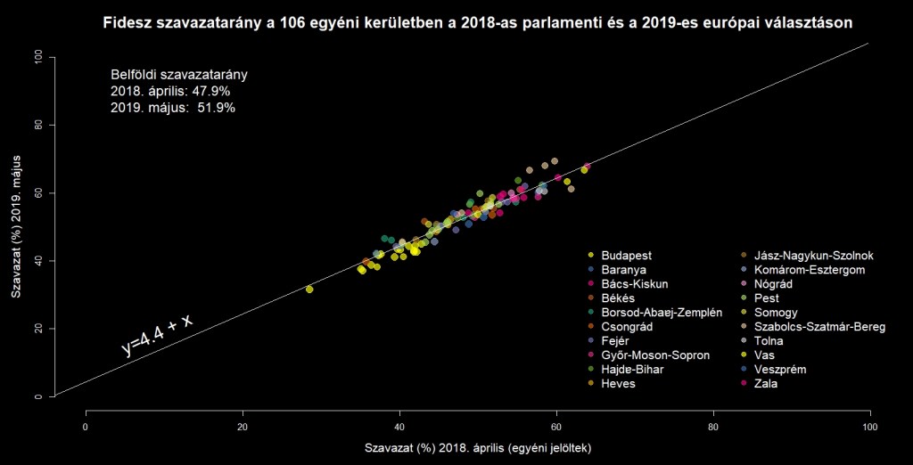 Ennyi feltevés után már a legmerészebb elme is megszomjazna néhány tényre. Ezért két ábrával illusztrálom, hogy valóban meglehetősen stabil az, hogy egymást követő európai és magyar parlamenti választásokon hol miként szerepel a két pártszövetség. Az első ábra a Fidesz-KDNP 2018-as egyéni jelöltjeinek és 2019-es Európai Parlamenti listájának eredményét hasonlítja össze választókerületenként. A 106 egyéni választókerületet egy-egy, a kerület megyéjét érzékeltetően kiszínezett köröcske jelzi az ábrában. A körök szép szimmetrikusan helyezkednek el az ábrát átlósan keresztező fehér vonal két oldalán, méghozzá igencsak közel a vonalhoz. Ha az előző bekezdésben bevezetett feltevés százszázalékig igaz lenne, akkor a köröcskék mind pont a vonalon helyezkednének el, tehát a 2019-es Európa Parlamenti választás eredményét halálbiztosan tudnánk előre jelezni a 2018-as szavazatarányok alapján. Elég lenne csak mindenütt 4,4%-ot hozzáadni a Fidesz-KDNP egyéni jelölt 2018-as eredményéhez, és pont megkapnánk a 2019-es Fidesz-KDNP listás eredményt egy teljesen más jellegű, egy évvel későbbi választáson.