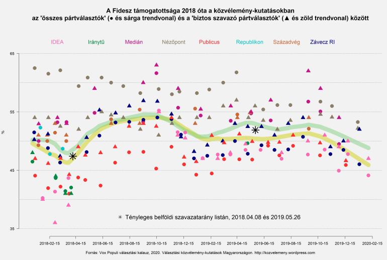 Pontosan annyival esett vissza a Fidesz 2019 májusa óta a Századvég közvélemény-kutatásaiban, mint a többi intézetek publikált becslései alapján számított trendvonal. Utóbbit ábránkon láthatja: a biztos szavazó pártválasztók közt 53-ról 49%-ra, az összes pártválasztók között durván 50-ről 46%-ra esett vissza a kormánypárt.