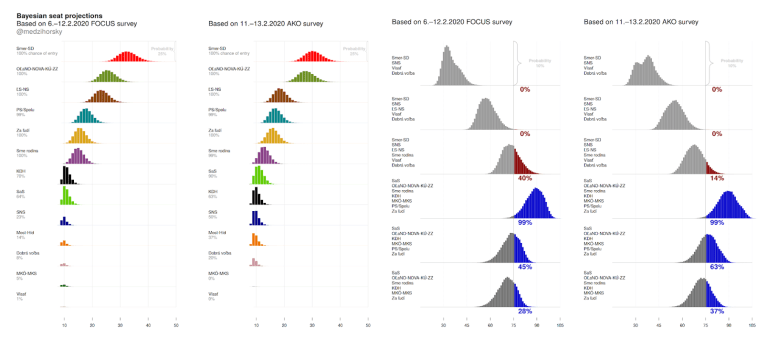 A 3. ábra két baloldali panelje mutatja meg, hogy a legutóbbi két hiteles közvélemény-kutatás alapján hány mandátumra számíthatnak az egyes pártok a 150 tagú parlamentben. Mindig a legvalószínűbb számértéknél száll legmagasabban az adott párt haranggörbéjének az íve. Az ábra jobbján pedig két panel azt mutatja immár a két közvélemény-kutatás alapján, hogy mennyi az esélye egyik illetve másik többségbe kerülésének esélye a parlamentben. Például a Smer-SD várható mandátumaránya 25 és közel 40% között, legnagyobb valószínűséggel éppen csak 30% felett van, és a pártnak szinte semmi esélye nincs arra, hogy egy Smer-SNS-Vlasť-Dobrá voľba koalíció többségbe kerülhetne, még akkor sem, ha a szélsőjobbos ĽS-NS-t is maguk közé veszik. A középjobb pártok és a Sme rodina koalíciója sokkal jobb esélyekkel pályázik a parlamenti többség megszerzésére, mint bármelyik most elképzelhető koalíció, amelyikben részt vesz a Smer és az SNS.