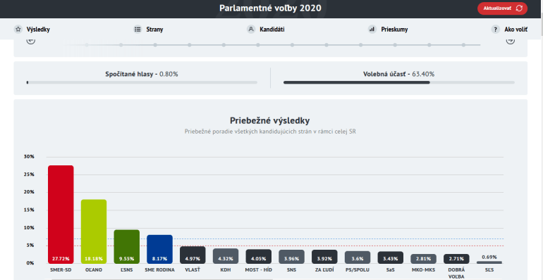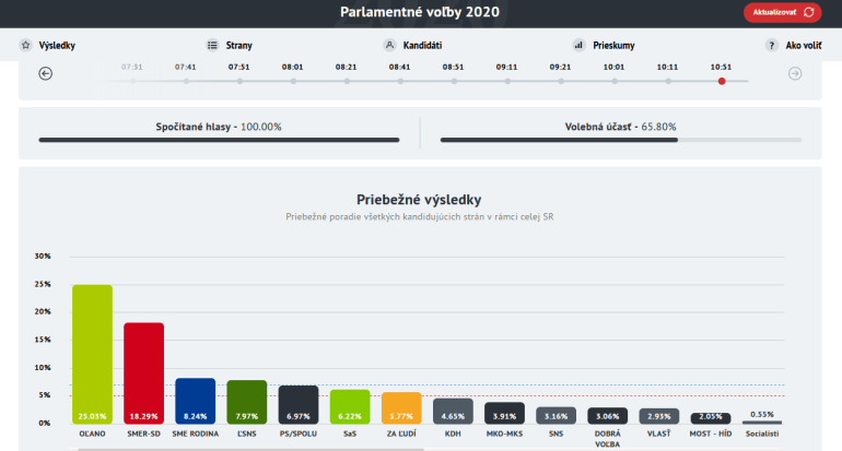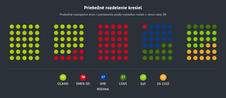 A liberális elnökasszony pártszövetsége, a PS-Spolu ügyesen kitornászta magát a parlamentből azzal, hogy törvénytisztelő szervezetként – és ellentétben az összes többi sokpárti törpeszövetséggel, ami önállóan indult el a választáson – két párt közös listájaként regisztrálta magát a választásra, és kb. 900-zal kevesebb szavazatot szerzett országszerte, mint amennyi a kétpárti listákra vonatkozó 7%-os bejutási küszöb átlépéséhez kellett volna (a névleg egypárti listákra 5%-os küszöb vonatkozott, akkor is, ha nyilvánvalóan több különböző párt választási szövetségéről volt szó). A Vox Populi közvélemény-kutatási összefoglalójában ugyancsak valamivel 50% felettire tettük annak esélyét, hogy a KDH bejut a parlamentbe, erről végül párezer szavazattal lemaradtak. A többi pártok tekintetében viszont nagyjából bejöttek a várakozások, a szavazatarányokban is inkább csak az OĽaNO vártnál sokkal nagyobb sikere, és a gyakorta fasisztának mondott, Marian Kotleba vezette ĽS-NS várakozásoktól elmaradó százalékaránya okozott meglepetést. A Smer és a többi pártok lényegében a két héttel ezelőtti közvélemény-kutatásoknak megfelelő arányban jutottak szavazathoz.