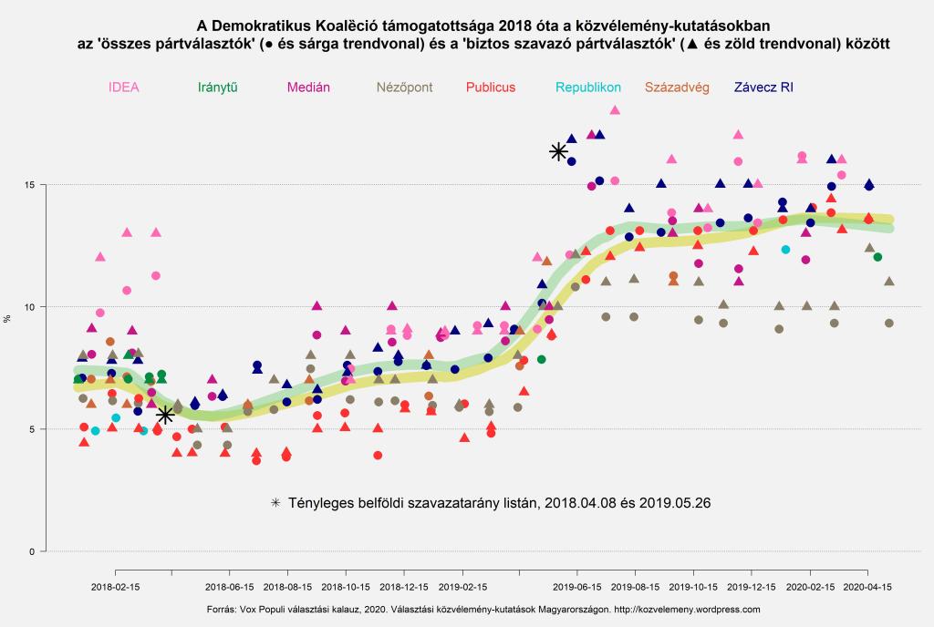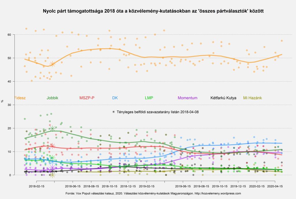 A múlt hét közepén végzett Nézőpont vizsgálatban viszont éppenséggel egy százalékot javított a hatpárti ellenzék, és ugyanannyit rontott a Fidesz a megelőző Nézőpont vizsgálat alapján közölt adatokhoz képest (ez a biztos szavazó pártválasztók között értendő, mert a teljes népességre vonatkozólag ők március óta most közöltek először adatokat: márciushoz képest a májusi adataikban a Fidesz-KDNP 2%-kal magasabban, az LMP és a meg nem nevezett „egyéb pártok” 1-1%-kal rosszabbul állnak). A megjelent címnél ezért pontosabb lett volna az, hogy „újra a Momentum a legerősebb ellenzéki párt” (ugyanis az áprilisi Nézőpont adatokban és az összes többi közvélemény-kutató valamennyi idei közleményében a DK volt az, a Nézőpontnál viszont január-márciusban is a Momentum állt előrébb).