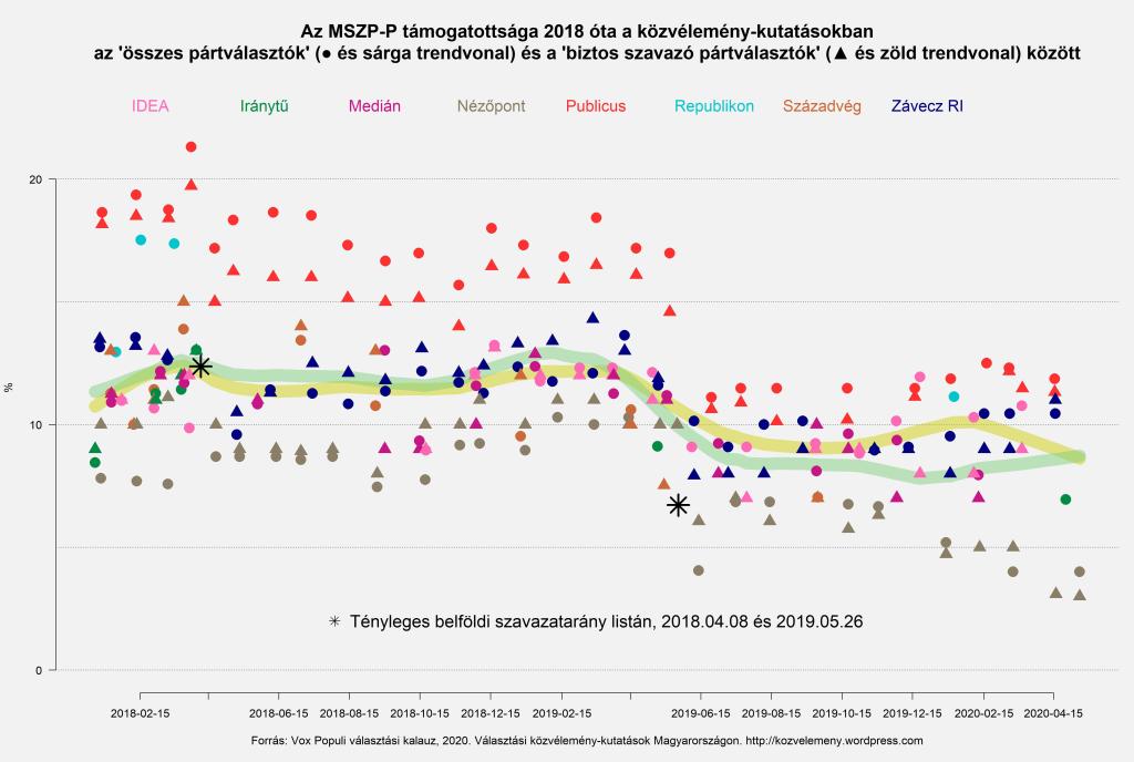 Sajnos, más közvélemény-kutatók eddig nem kecsegtettek minket ilyen izgalmakkal, mert azoknál rendre 1-2% állt idén a Kutyapárt (egyedül az IDEA januári adataiban tűnt fel 3%-nyi kutyapárti a biztos szavazó pártválasztók között). A Nézőpont és a többi intézetek között a Kutyapárt tekintetében tavaly augusztusban jelent meg először ez az azóta teljesen szisztematikus különbség, hónapokkal azelőtt, hogy a Nézőpont Intézet a személyes kérdezésen alapuló adatokat publikálásával felhagyott volna, és inkább a telefonos vizsgálataikra kezdte el alapozni a nyilvánosságnak szánt beszámolóikat. A Vox Populi szerkesztőségében továbbra is tanácstalanul, bár növekvő kíváncsisággal szemléljük az időközben tényleg meghökkentő méretűvé nőtt, és senki által eddig meg nem magyarázott különbséget az Alkotmány utcában felemelkedett szakemberek és az egyéb közvélemény-kutató intézetek eredményei között, aminek az ellenpárja az MSZP-Párbeszédre vonatkozó becslésekben található: ez a Nézőpontnál az utóbbi hetekben stabilan 3%, másoknál 7 és 11% között volt.