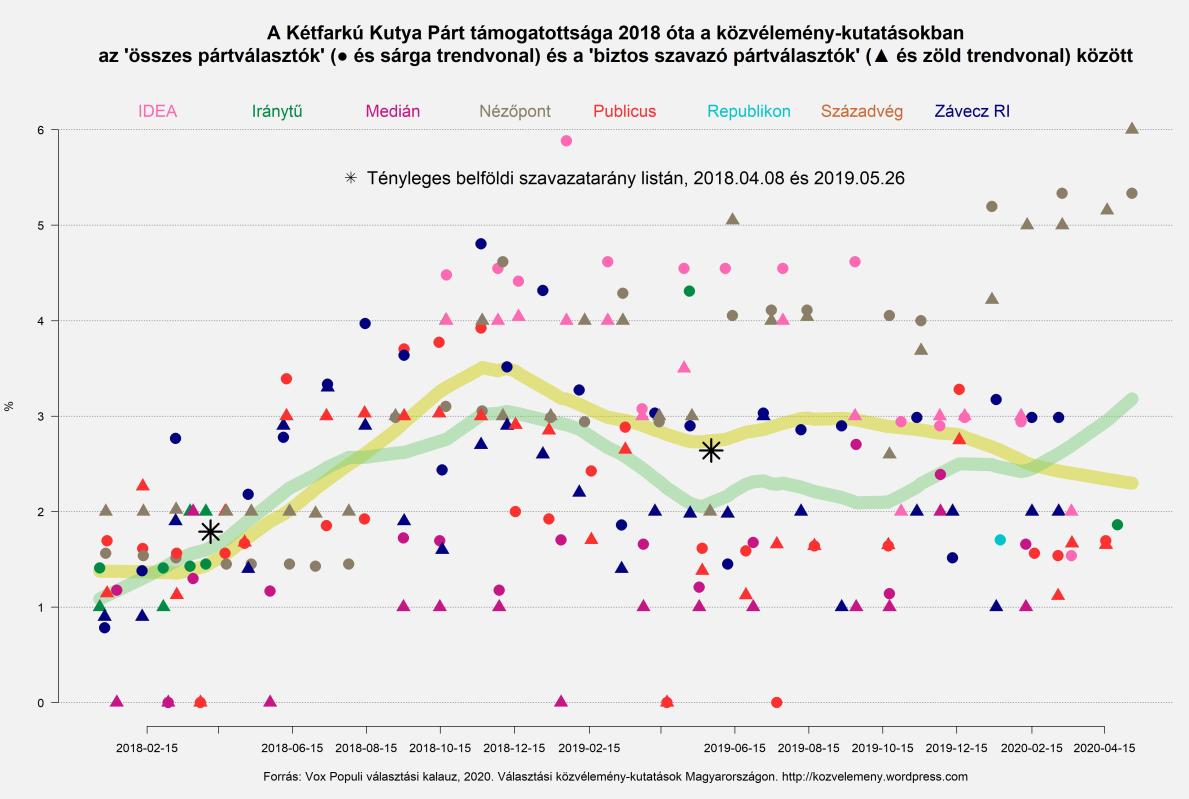 Sajnos, más közvélemény-kutatók eddig nem kecsegtettek minket ilyen izgalmakkal, mert azoknál rendre 1-2% állt idén a Kutyapárt (egyedül az IDEA januári adataiban tűnt fel 3%-nyi kutyapárti a biztos szavazó pártválasztók között). A Nézőpont és a többi intézetek között a Kutyapárt tekintetében tavaly augusztusban jelent meg először ez az azóta teljesen szisztematikus különbség, hónapokkal azelőtt, hogy a Nézőpont Intézet a személyes kérdezésen alapuló adatokat publikálásával felhagyott volna, és inkább a telefonos vizsgálataikra kezdte el alapozni a nyilvánosságnak szánt beszámolóikat. A Vox Populi szerkesztőségében továbbra is tanácstalanul, bár növekvő kíváncsisággal szemléljük az időközben tényleg meghökkentő méretűvé nőtt, és senki által eddig meg nem magyarázott különbséget az Alkotmány utcában felemelkedett szakemberek és az egyéb közvélemény-kutató intézetek eredményei között, aminek az ellenpárja az MSZP-Párbeszédre vonatkozó becslésekben található: ez a Nézőpontnál az utóbbi hetekben stabilan 3%, másoknál 7 és 11% között volt.