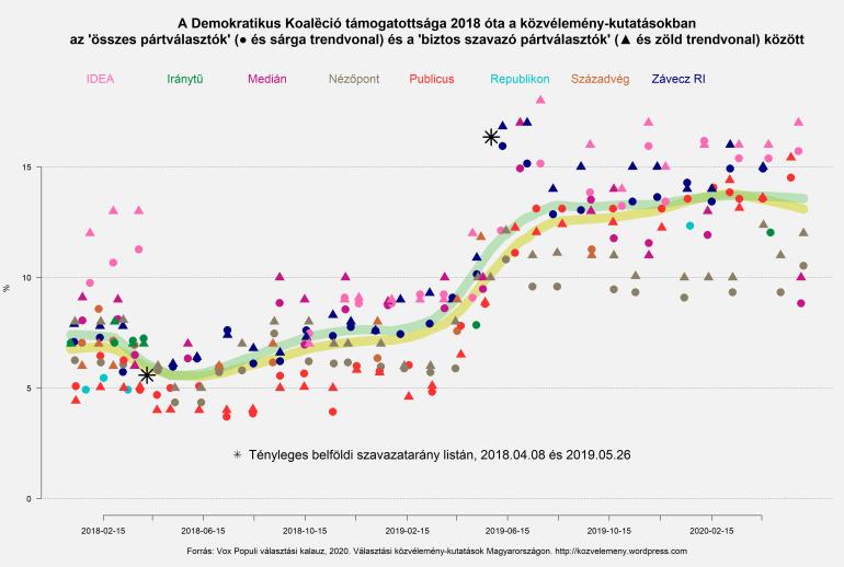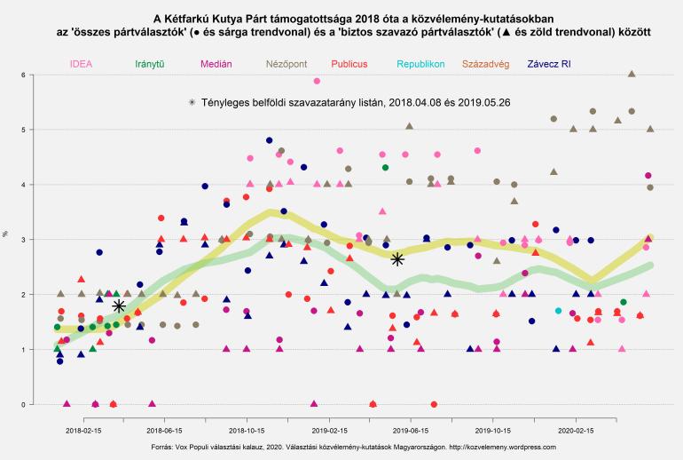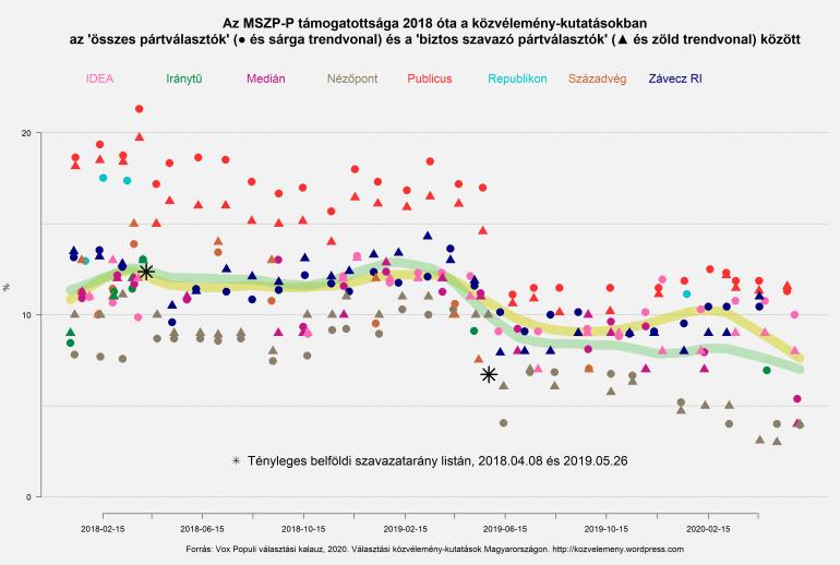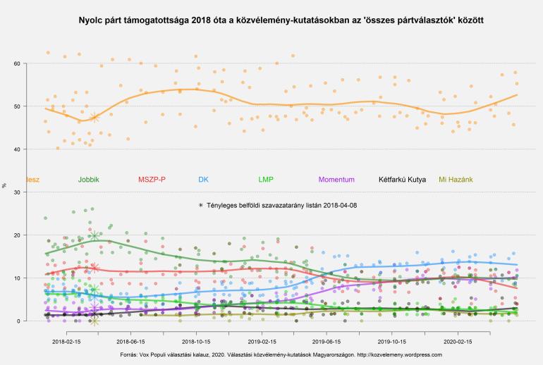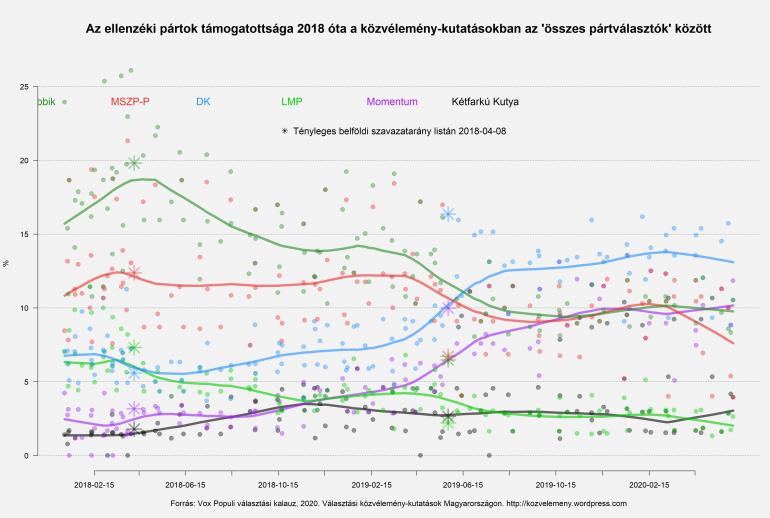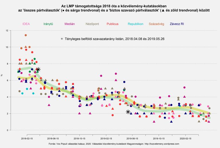 Hasonló, csak jóval alacsonyabb szinten zajló mozgást láthatunk az LMP esetén is: nagy visszaesés 2018 második felében és 2019 tavaszán, a szünetekben stagnálás. A Jobbikkal ellentétben azonban az LMP 2020 első hónapjaiban újra leszálló ágba került, az év eleji 3% helyett ma már inkább csak 2%-ra tartják őket a közvélemény-kutatások.
