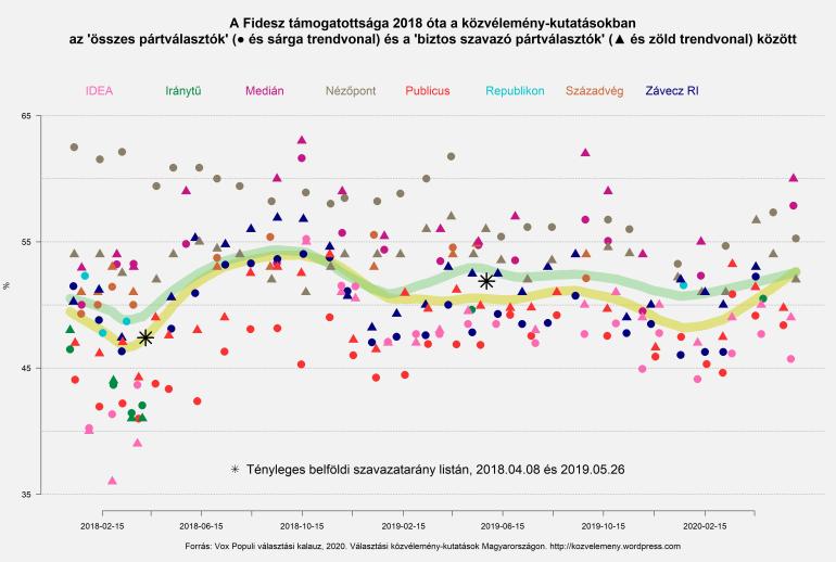 A hosszabb távú trendek értékelését megnehezíti, hogy a kormánypárti közvélemény-kutató intézetek tavaly ősz óta alig-alig publikálnak friss adatokat. Ez akár oka is lehet a Fidesz késő őszi visszaesésének az adatokban, hiszen korábban részben a Nézőpont Intézet számai tartották olyan magasan a Fideszre vonatkozó becslések átlagát. De persze az is lehet, hogy pont a Fidesz számára kedvezőtlen eredmények magyarázzák a közlemények megritkulását. A Századvég ugyanis szeptember óta egyáltalán nem publikált friss adatokat, és a Nézőpont is többnyire inkább politikai kommentárokat, mint friss pártpreferencia adatokat publikált augusztus óta.