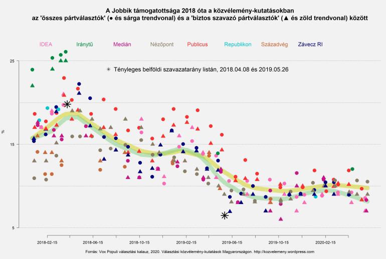 A 2018-as választáson legerősebb ellenzéki pártként induló Jobbik az akkori választási kampányban jócskán erősödött, a választások után viszont egy gyors lejtmenetre került, ami csak 2018/19 telén állt meg egy időre, majd 2019 tavaszán megint felpörgött. Tavaly nyár óta a párt népszerűsége egy nagyon szűk sávon belül ingadozva inkább alulról súrolja a 10%-ot, amit persze jócskán alúlmúltak az ő híveiket talán kevésbé mozgósító európai választásokon.