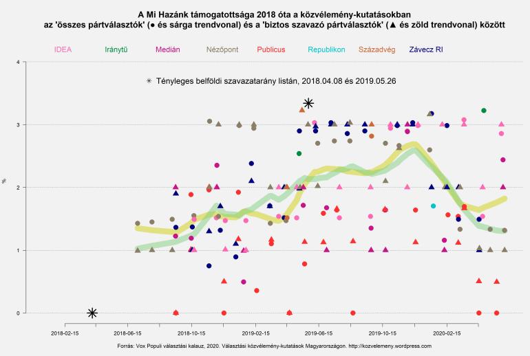Az MKKP-éhez hasonló sávban, csak más trenddel mozog az inkább Orbán Viktorral, mint ellenzékével rokonszenvező volt jobbikosok Mi Hazánk pártja is. 2018 nyári megalakulásuktól kezdve nagyon lassan, de folyamatosan növekedett támogatottságuk úgy 3%-ig, 2019 utolsó hónapjaiban viszont markánsan visszaesett látható támogatottságuk. Igaz, az európai választások azt sejtették, hogy az MKKP-vel ellentétben őket kissé alulbecsülik a közvélemény-kutatások.