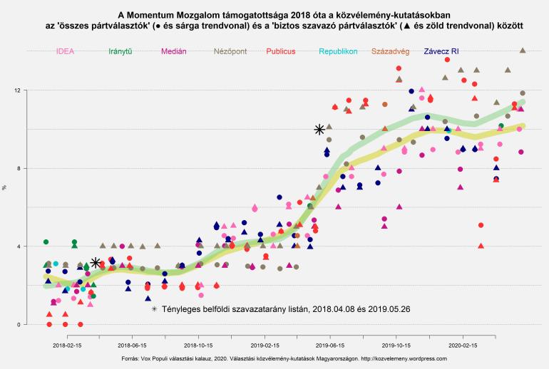 A Momentum trendvonala a DK-éval párhuzamosan ívelt fel 2018-19-ben egészen tavaly novemberig, azóta lényegében stagnál 11% táján – igaz, mint ábránk mutatja, az ő európai választási eredményeiket is alábecsülték a 2019 tavaszi közvélemény-kutatások.