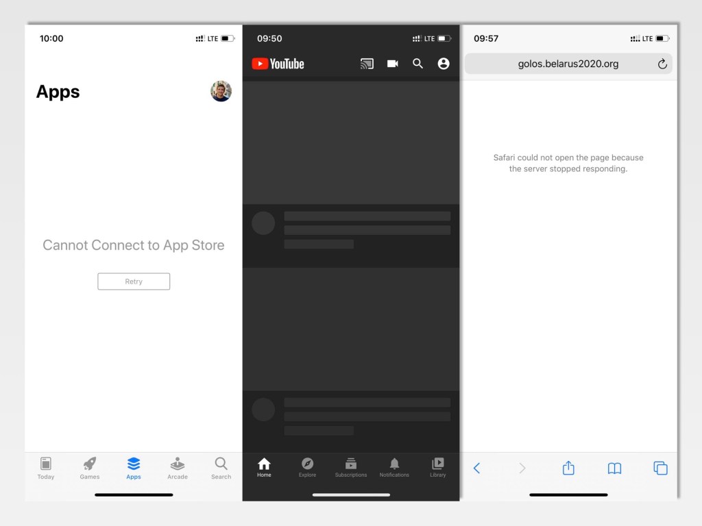 Lényeges fejlemény eddig, hogy reggel nyolc óta legalábbis Minszkben elérhetetlenné vált a Facebook, a Messenger, a Whatsapp, a YouTube, az Instagram, az App Store, és persze az ellenzék szavazatszámláló stb. oldalai, a legtöbb VPN sem működik. Képünk mutatja, miként néz ki ilyenkor a telefon.