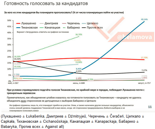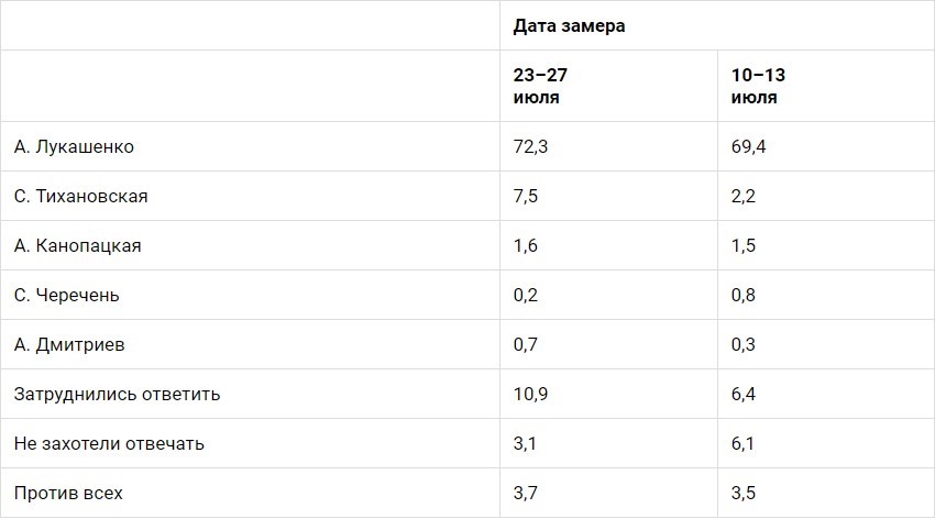 Ami a jelölteket illeti, Lukasenko, mint mind az öt megelőző elnökválasztáson, most is 77% feletti eredményre aspirálhat: a megkérdezetteknek ugyan csak 72.3%-a mondta, hogy rá szavazna, de volt 14%, aki még nem tudta, mit tegyen, vagy nem akarta megmondani, hogy kire szavazna, és nehéz elhinni, hogy csak eltökélt ellenzéki szavazók mondanák ezt. Az ellenzéki jelöltek közül a cég korábbi vizsgálatához képest feljövő Tyihanovszkaja már 7.5%-on állt, az inkább álellenzékinek tartott másik három jelölt most már erősen lemaradt tőle, a “mindegyiket elutasítom” opció választását pedig 3.5% fontolgatta. (Ez a lehetőség még a szovjet választások örökségeként maradt fent Belaruszban. Bár nagyon demokratikusnak hangzik, hogy így is lehet szavazni, politikailag cseles a hatása: Vladimir Gelman orosz politikatudós annak idején azzal magyarázta a lehetőség posztszovjet utóéletét, hogy jellemzően azok választják, akik máskülönben az ellenzékre szavaznának, így a „mindenki ellen” szavazólapon való jelenléte az ellenzéki jelöltek számára kiosztandó mandátumok arányát csökkenti.)