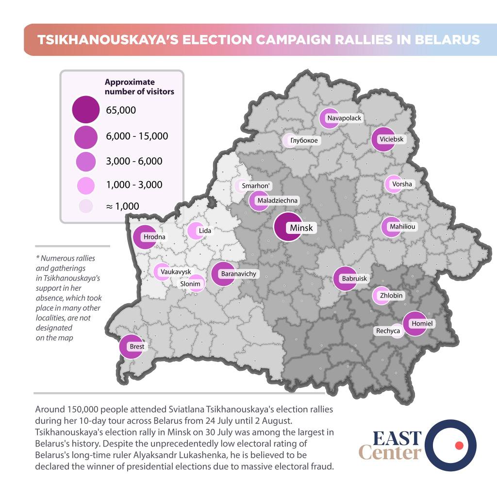 Na de Minszkben a hivatalos közvélemény-kutatásoknak kell hinni, azok szerint pedig Lukasenkonak nem lesz szüksége egy augusztus 23-i második fordulóra, már most vasárnap elsöprő sikerét jelezheti a hivatalos eredmény. Erre tippelt a magyar Political Capital elemzése is, ami azonban sietve hozzáteszi, hogy ezek után választási csalást vélelmező ellenzéki tüntetők fogják elárasztani a minszki utcákat. Hogy a rendfenntartó erők elég lojálisak lesznek-e az elnökhöz ahhoz, hogy igazán keményen reagáljanak, azt még meglátjuk. De ettől függetlenül a cikk úgy véli, hogy az események alighanem elvezetnek majd Lukasenko bukásához vagy nyugdíjazásához. Konkrétan a 2018-as, tüntetések kikényszerítette, de az országot egyértelműen az orosz szövetségesi rendszeren belül tartó örményországi kormány- és rendszerváltáshoz hasonló földcsuszamlást tart elképzelhetőnek. Annyi biztos, hogy sokan sokfelé elgondolkodhatnak azon, hogy a rendőrség által lépten-nyomon gáncsolt, betiltott stb. Női Szolidaritás kampány néhány hét alatt hogy tudott eljutni olyan sok emberhez. A képünkön látható térkép mutatja azt, hogy a három vezérré nőtt nő választási gyúlésein hol hányan jelentek meg.