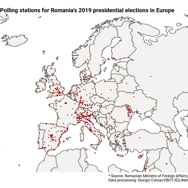 Ábránk Európa térképen mutatja meg, hogy hol nyitottak meg szavazóhelyiségeket a 2019-es román elnökválasztás alkalmából (a szavazóhelyiségek tényleges számát nem pontosan adja vissza, mert voltak városok, ahol több szavazóhelyiség is fogadta a román szavazókat három napon át). Természetesen ott volt a legtöbb, ahol a legtöbb román útlevelet használó szavazó él, ezért sokkal több a pötty a pici Moldovában mint a nagy Oroszországban. Ezért Olaszországban például a legtöbb román szavazópolgár max. 40 percnyi, de inkább rövidebb utazással eljuthatott otthonából a legközelebbi román szavazóhelyiséghez.