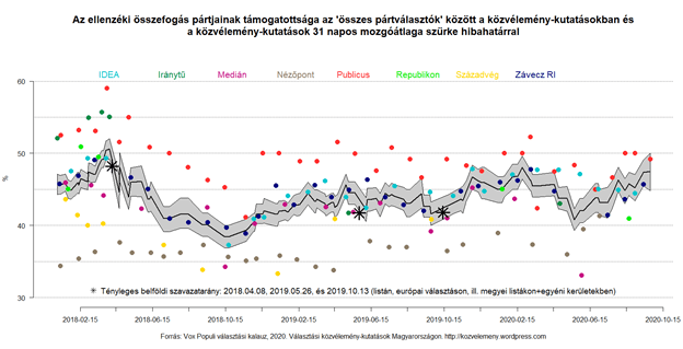 Ennek érdekében trendvonalakkal és mozgóátlagokkal összegeztem az összes, 2018 kezdete óta megjelent választási közvélemény-kutatást. Minden publikált közvélemény-kutatásról kikutattam, hogy pontosan mikor gyűjtötték az adatokat, és a terepmunka félidejét neveztem ki az adott vizsgálat “dátumának”. A szöveges összefoglaló bemutatja, hogy a különböző intézetek mérései mozgóátlagok és trendvonalak számításával is összegezhetők, és 2018-19-ben mindig elég pontosan előre jelezték a várható választási eredményeket. Igaz viszont, hogy érdektelen technikai részletektől függően kissé eltérő eredményeket kaphatunk a Fidesz vagy az ellenzék aktuális támogatottságáról. Ezek az eltérések tovább nőnek, ha megpróbáljuk kiküszöbölni azoknak a csak látszólagos ingadozásoknak a hatását, amelyek pusztán abból fakadnak, hogy a választásoktól távol eső időpontokban nem minden kutatóintézet publikál adatokat, illetve nem egyforma gyakorisággal.