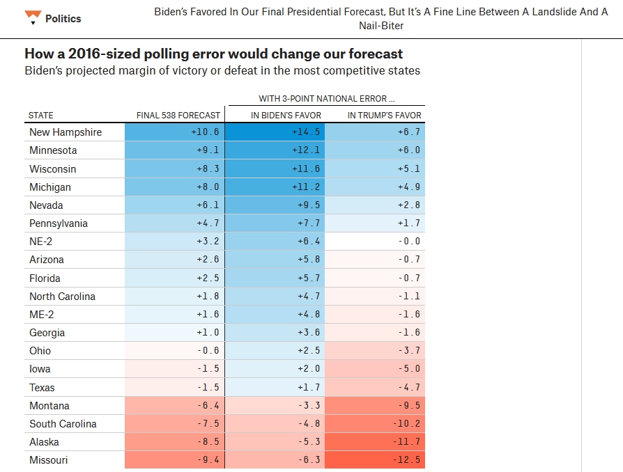 Semmi szokatlan nincs abban, ha most a 2016-os emlékek miatt pont a fordított hiba jellemző arra, ahogy a tájékozottabb olvasók is érzékelik az esélyeket. A torzítás korrekciója érdekében nem árt felidézni ezért, hogy a 2016-os előrejelzési hiba oka nem valami rejtélyes és mind máig feltáratlan dolog volt, hanem az, hogy a közép-nyugati államokban több, részben javítható hiba miatt a kevésbé iskolázott Trump-szimpatizánsok szavazási hajlandóságukhoz képest alulreprezentáltak voltak a kutatásokban, amik tévesen jeleztek előre 5-6%-os Clinton vezetést 4-5 olyan államban, ahol végül szoros küzdelemben nyert vagy vesztett az utolsó napok FBI-botrányát követő kis mértékű Trump erősödés nyomán.