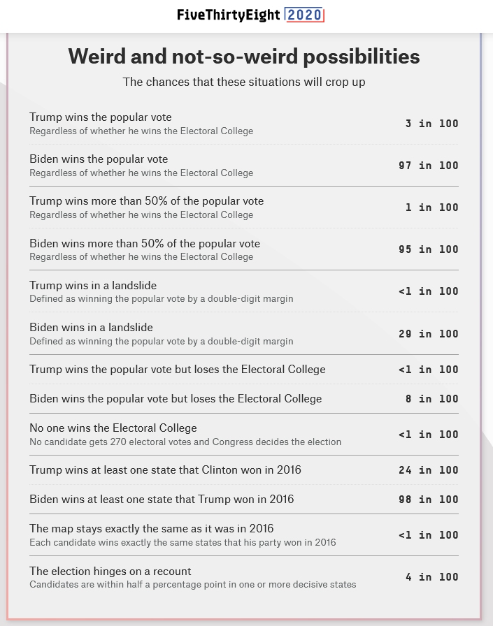 A közvélemény-kutatási alapú előrejelzések közül szerintem a fivethirtyeight.com terméke áll elméletileg, empirikusan, történelmi hibarátája és a felhasznált adatok köre tekintetében legjobb alapokon, ezért szerintem elég azt elolvasni. Ők tíz százalék esélyt adnak Donald Trump, és 89-et Joe Biden elnökválasztási győzelmének. A képviselőházról szólva szinte biztosnak tartják, hogy megmarad a Demokrata többség, a mértékén azonban még sok minden múlhat, például a klímapolitikai célkitűzések részletei is. A szenátusi választás eredményén pedig talán minden másnál több múlik. Nate Silverék 75%-osnak tartják a Demokrata többség létrejöttének az esélyét, de például a Legfelsőbb Bíróság esetleges kibővítése, vagy hogy Puerto Rico meg Washington DC állami rangot kap-e majd a választások után (ami nagyjából felszámolná a Szenátus összetételében most a Republikánusokat túlreprezentáló földrajzi torzítást), azon múlhat majd, hogy mekkora a többség nagysága. A fivethirtyeight végső elnökválasztási előrejelzésében pedig az alábbi ábra lehet az ínyencek kedvence, mert ez egészen bizarr lehetőségek valószínűségét is derekasan számszerűsíti, amennyire csak a tudomány mai állása megengedi.