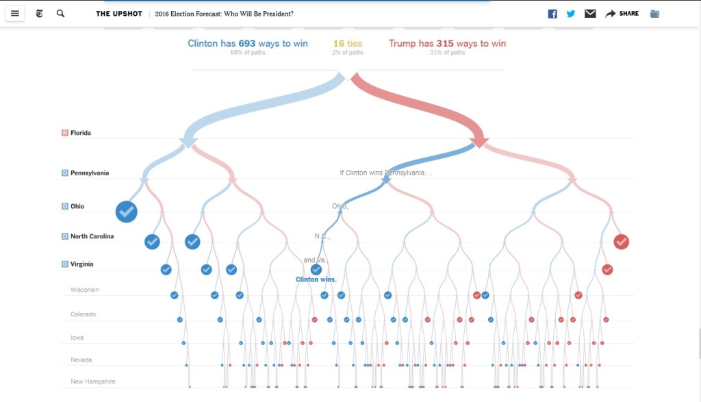 A kontextus kedvéért érdemes felidézni a 2016-os előrejelzéseket, amiket akkor klassz táblázatokban foglalt össze a New York Times (ld. fentebb). A közhiedelemmel ellentétben a komoly elemzők korántsem mondták biztosra Clinton győzelmét, a Times pedig egy remek grafikával mutatta meg még azt is, hogy Trumpnak 315 legalábbis nem teljesen elképzelhetetlen útja mutatkozott a választási győzelemhez, szemben Clinton 693 útjával (ld. alább).