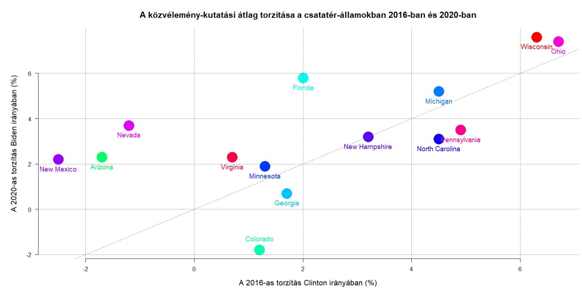 Az államok elhelyezkedése a két tengelyen közepesen erősen korrelál (r=0.60). Pennsylvania, Észak-Karolina, Georgia, és Kolorádó az átló szaggatott vonala alá esik, ami azt jelenti, hogy a 14 államból ebben a négyben kevesebbet tévedtek a Demokrata jelölt javára 2020-ban, mint 2016-ban. Jókorát nőtt viszont a Demokraták túlbecslése Florida, Nevada, Arizona, és Új-Mexikó államokban, ahol – az egy Florida kivételével – még éppen Trump javára tévedtek egy kicsit 2016-ban. Ha ettől a négy, jelentős spanyolajkú népességgel rendelkező államtól eltekintünk, akkor a 2016 és 2020 közötti változások szerények, és nem mutatnak világos tendenciát.