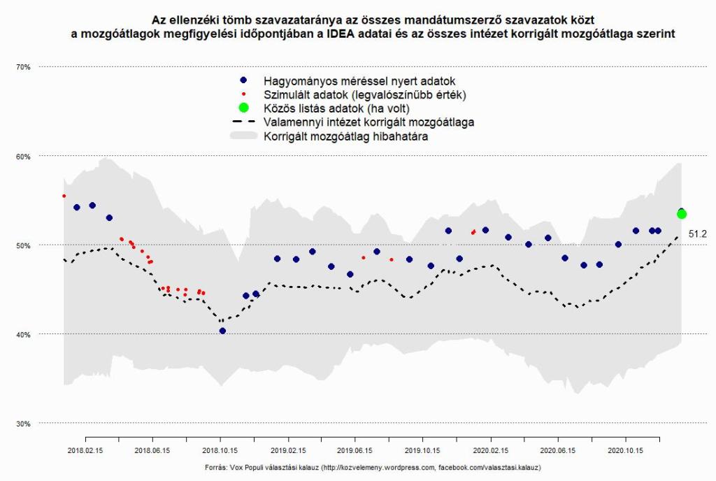 Az Idea most az előbbi megoldást választotta, és példás világossággal és szerintem meggyőzően magyarázzák el, hogy miért ez a megoldás adja a jelenleg legrealisztikusabb szimulációját a tényleges döntési helyzetnek. Bár a többi vizsgálat módszertani részletei kevésbé ismertek, mint a friss Ideás adatoké, a közös listás kérdés Medián- illetve Závecz-féle megfogalmazása – utóbbi „hat együttműködő ellenzéki párt (DK, Jobbik, LMP, Momentum, MSZP, Párbeszéd) közös listájáról” beszél, ld. itt 25:56-tól – igen hasonló az Idea által alkalmazott megoldáshoz, ami azt kérdezi, hogy „Melyik párt, pártszövetség listájára szavazna egy most vasárnap tartandó országgyűlési választás alkalmával: a Fidesz–KDNP közös listájára, az ellenzéki pártok közös listájára (DK+Momentum+Jobbik+MSZP+LMP+P), a Magyar Kétfarkú Kutya Párt listájára, a Mi Hazánk Mozgalom listájára, vagy egyéb párt listájára”, megengedve még a következő válaszlehetőségeket is: ebben a pillanatban ezt nem tudom megmondani; van véleményem, de azt nem kívánom megosztani; egyikre sem; semmiképp sem mennék el.