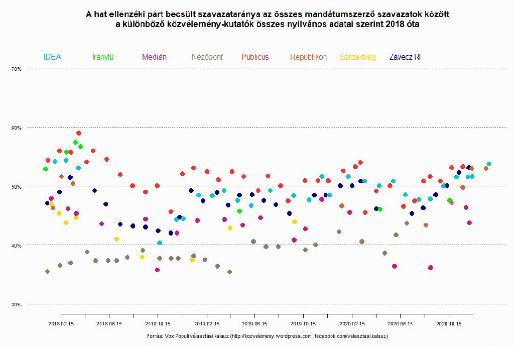Átvette a közös indulást tervező ellenzék a vezetést a Fidesz előtt a közvélemény-kutatások alapján várható belföldi szavazatarányokban. Az ennél pontosabb ítélkezést megnehezíti, hogy a december végi-január eleji ünnepi időszak miatt szokatlanul nagy hiányjel van az adatsorokban, és még kevés is a friss adat, meg picit ellent is mondanak egymásnak. Az Idea Intézet frissen publikált januári vizsgálatában (hibahatáron belül) folytatódott a Fidesz őszi visszaesése, a Republikon és a Nézőpont pár nappal korábbi számaiban viszont megállt. Hogy a kettőből melyik történt, attól függ az ellenzéki vezetés mértéke, és hogy a parlamenti mandátumok számában még mindig a Fidesz van-e némi előnyben, vagy már az ellenzék készülhetne kormányalakításra, ha valódi parlamenti választáson születne a jelenleg várható szavazatmegoszlás.