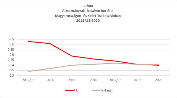 A 3. grafikon az elmúlt évtized leghihetetlenebb fordulatát mutatja: ha árnyalattal is, de még a WJP elemzésében szereplő három közép-ázsiai volt szovjet posztkommunista állam, az itt összefoglalóan és önkényesen (az egész különlegesen autokratikus Türkmenisztántól megkülönböztetve) Kelet-Turkesztánnak nevezett Kazahsztán, Kirgizisztán és Üzbegisztán első emberének hatalma sem oly korlátozatlan, mint a végrehajtó hatalom magyarországi birtokosáé. Ez elsőre valószerűtlennek tűnik. De ha végiggondoljuk, hogy van-e törvény vagy szervezet, ami az alkotmányozó többséget birtokló magyar miniszterelnök hatalmát korlátozni lenne képes, beláthatjuk, ilyen nincs. Nincs az a képtelenség, ami itt ne történhetne meg. A helycsere oka tehát nem a türk népek családjának a joguralom birodalma felé tett nagy ugrása.