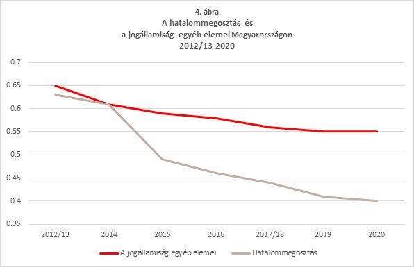 A 4. grafikon szemlélteti a magyar fejlődés lényegét. A fokozatos lecsúszás a jogállamiság-indexet alkotó valamennyi mutató (korrupció, nyílt kormányzás, alapjogok, a szabályozások kikényszerítése, büntető és polgári bíráskodás) tekintetében (kivétel a rend és biztonság, ebben a mutatóban Magyarország a jók között van) a jogállam tudatos lebontásának következménye. De ezek mégis csupán járulékos elemei az „alkotmányos keretek között megvívott forradalom” apropóján létrehozott új rendszernek.