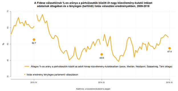 Pontosan ezt a reménytelenséget mutatja a közvélemény-kutatási eredmények rendkívüli egyhangúsága az utóbbi években. Ha a mintavételi hibák és az intézetek közötti eltérések okozta zaj hatását kiszűrjük, akkor évről-évre alig változik a Fidesz és az ellenzék versenyfutásának állása. Az utóbbi évek egyetlen földindulása a 2018-as választás után zajlott le, és az ellenzéket sújtotta (ld. ábránkat). Ekkor egyrészt elpárolgott a megelőző egy évben hellyel-közel még Török Gábort is elragadó hit, hogy az önállóan induló Jobbik érdemi kormánytényezővé válhat. Az ellenzéki együttműködést felvállalni nem tudó vezetők és szervezetek távoztak a Jobbikból, az ellenzék jobbszárnyának népszerűsége megroppant, korábbi támogatói egy része a Mi Hazánkhoz és a Fideszhez pártolt át. A baloldali és liberális közönség figyelmét persze inkább a 2019 őszi önkormányzati választásokon elért ellenzéki félsiker keltette fel, meg hogy a DK és a Momentum Mozgalom előrébb lépett az MSZP, az LMP és a Jobbik rovására. De az alapkérdésben az a döntő, hogy az ellenzék hat pártjának együttes támogatottsága a pártot választani tudó magyarországi lakcímmel rendelkező szavazópolgárok között 8-9 százalékkal visszaesett a 2018-as választások után, és ezt azóta sem sikerült ledolgozniuk (sőt, a két 2019-es választáson az alacsonyabb részvétel meg a független stb. önkormányzati jelöltek miatt még a közvélemény-kutatások által mutatott szavazatarányt sem érték el).