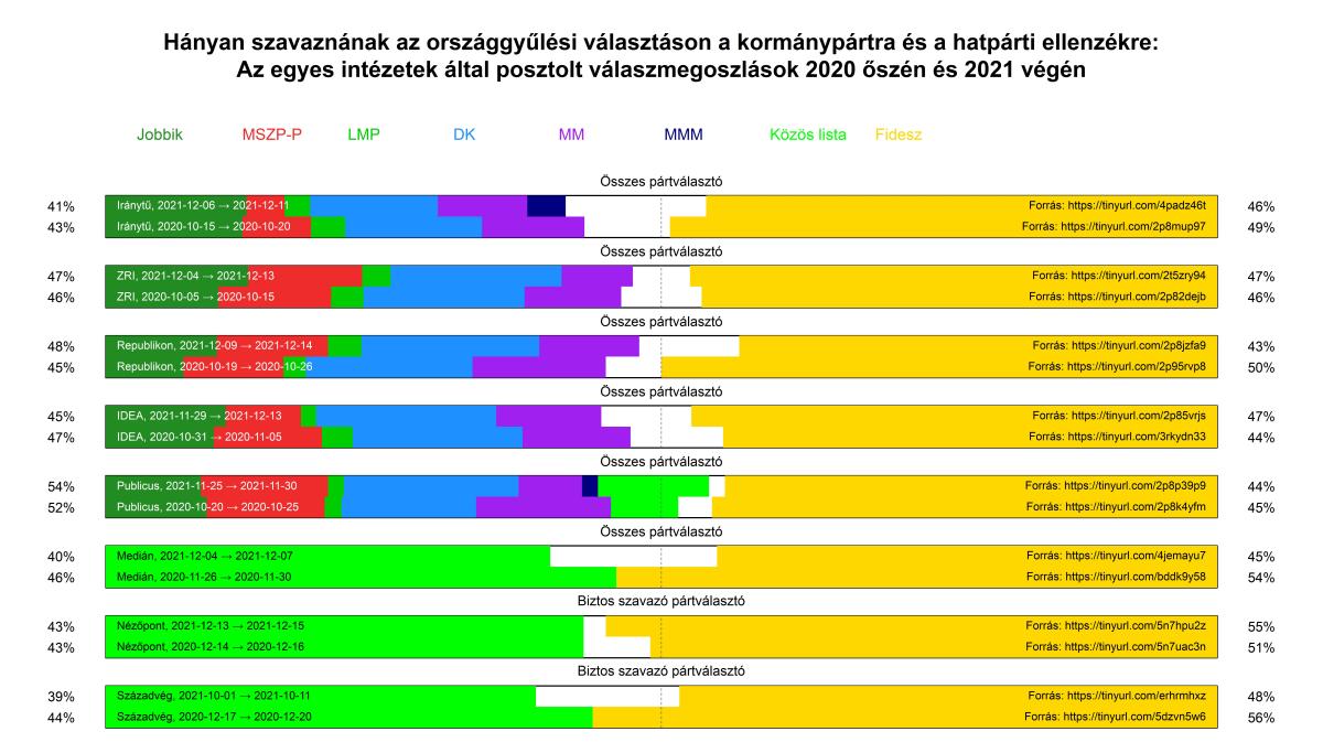 Amit most még érdemes előtte hozzátenni, az az, hogy mennyit változtak a közvélemény-kutatások a 2020. októberi borsodi időközi országgyűlési képviselőválasztás óta. A fentebb mellékelt ábra minden releváns összehasonlítási alappal szolgáló intézet adatai közül egymás mellé teszi a 2020 október végéhez, illetve 2021 decemberéhez legközelebb eső adatokat (januári adattal még csak a Nézőpont szolgált, illetve arról nem tudjuk, hogy milyen értelemben nevezhető egyáltalán adatnak). A lényegi eredmény az, hogy intézetről intézetre változik az összkép, de mindegyiknél csak pici, hibahatáron belüli, egymással ellentétes irányú – tehát összességében véletlenszerűnek látszó – változás történt 2020 ősze óta a Fidesz és az ellenzék támogatottsága közti különbségre vonatkozó adatokban.