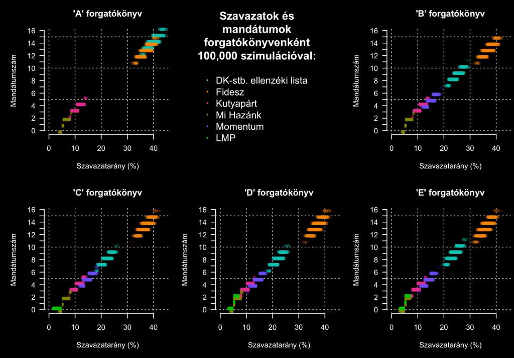 Egyenként százezer szimulációt végeztem mind az öt lehetőséggel. A százezer lehetőség mindig csak abban a mértékben variálja a szavazatok várható megoszlását az adott forgatókönyv keretein belül, mint amennyire egy átlagos közvélemény-kutatás statisztikai hibahatára alapján várhatnánk. Tehát például egy fixen 37%-os helyett 37±3 százalékos Fidesszel kalkulálnak. Aztán kiszámoltam mind az ötszázezer szavazatmegoszlás esetén a 32 fővárosi listás mandátum megoszlását. A teljes transzparencia jegyében az R nyelven olvasók itt kereshetnek kákát a számítógépes kódban, ami a szimulációkat és az ábrát létrehozta.