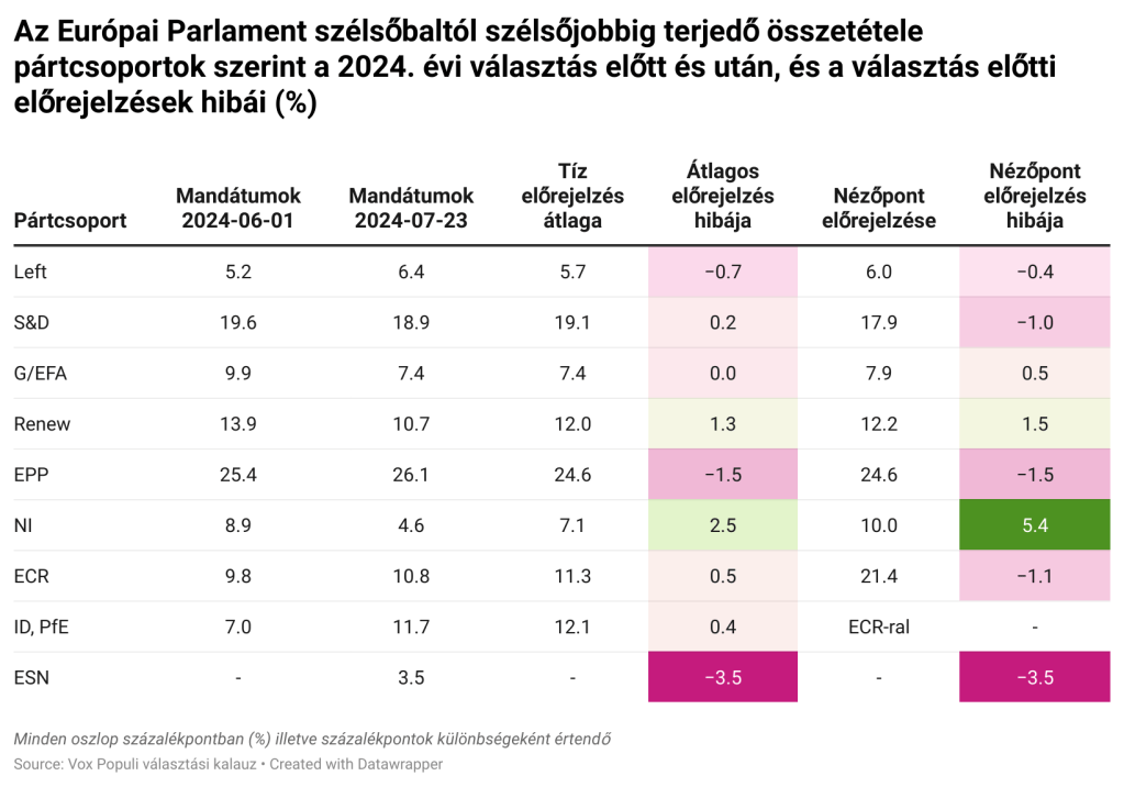 Mint a táblázatból is látható, az előrejelzések hibái a változatlan formában fennmaradó pártcsoportok esetében minimálisak voltak (a hibáik kiszámításánál a 2024 választások előtt létező ID csoportot ekvivalensnek tekintem a PfE csoporttal, ami a választások után az ID tagjaiból, egy korábbi ECR tagból és néhány korábban semmilyen pártcsoporthoz nem tartozó pártból, köztük a Fideszből, alakult meg). A legnagyobb hibák abból fakadtak, hogy senki nem látta előre azt, hogy az ID helyett két új frakció jön majd létre a választás után (a PfE és az ESN), ezekhez viszont igen sokan csatlakoznak majd az addig frakción kívüliek közül. Egyebekben meglepetésmentes volt a választás eredménye, és jóval kisebbek az előrejelzési hibák, mint amihez magyar nemzeti választások esetén van dolgunk. Ahogy várható volt, az Európai Bizottság parlamenti bázisát adó EPP-S&D-G/EFA-Renew koalíció többsége vékonyodott – 69-ről 63%-ra -, míg a markánsan nacionalista frakciók mérete összességében kilenc százalékkal nőtt, ami alapvetően a pártcsoporthoz korábban nem tartozó pártok mandátumarányának váratlan csökkenése miatt haladta meg az előzetes várakozásokat.