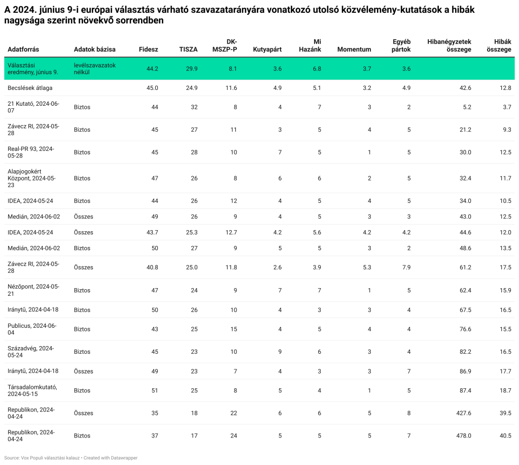 Az egyes intézetek becslései a hibák nagysága szerinti sorrendben vannak felsorolva, tehát a legpontosabb ezúttal a 21Kutatónak az utolsó pillanatban készült és csak a választás estéjén a Partizán csatorna élő músorában bemutatott becslése bizonyult, ami a táblában közvetlenül az összes előzetes becslések átlagát mutató második sor alatt látható. Mint más választási években, úgy 2024-ben is volt még pár kutatás a sok közül, amelyik az összes becslés átlagánál pontosabbnak bizonyult, de hogy 2024-ben ezek pont a Závecz, a Reál-PR 93, az Alapjogokért Intézet és az IDEA lesznek, azt ezúttal sem lehetett megsaccolni sem az intézetek korábbi eredményei, sem módszertana, sem kutatásuk dátuma alapján. Az a szolíd matematikai törvényszerűségeket követő várakozás viszont beigazolódott, hogy a különböző becslések átlaga a kutatások zöménél, sőt az átlagos hibanagyságú kutatásnál is pontosabb előrejelzéssel fog szolgálni.