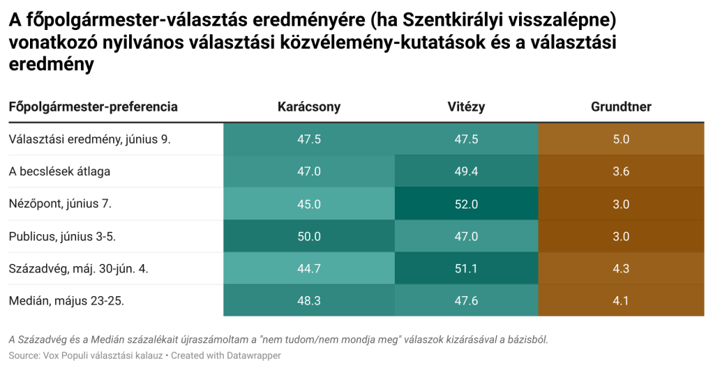 Szentkirályi Alexandra fideszes jelölt visszalépése a választásról két nappal a voksolás előtt csak három jelöltet hagyott a szavazólapon, és ezek közül az addig Karácsony Gergely mögött a második-harmadik helyen álló és meglehetősen lemaradó – de az élő televíziós vitákban hatásosan szereplő és ezzel hátrányát valószínűleg csökkentő – Vitézy Dávid a Fidesz-KDNP támogatásának köszönhetően komoly esélyessé lépett elő. Egyedül a Nézőpont intézet publikált a visszalépés után készült kutatást. De mivel a visszalépést hónapokkal korábban is egy reális lehetőségként kezelte az összes kutató, ezért a Medián, a Századvég, és a Publicus is publikáltak olyan kérdésekre kapott válasz-megoszlásokat is, amelyek feltételes módban azt kérdezték, Karácsony és Vitézy, vagy Grundtner (Mi Hazánk) és Karácsony és Vitézy közül kit választana, ha Szentkirályi visszalépne. Azt, feltételezem, nem tették hozzá a kérdezők, hogy “és a Fidesz Vitézy Dávid támogatására szólította fel a híveit”, ezért nem voltak kifejezetten könnyű helyzetben a végül is ténylegesen előállt választási szituáció modellezésében. Ennek ellenére elég közel kerültek a végeredmény eltalálásához, érdemes ezért összehasonlítani őket az elvileg nagy versenyelőnnyel induló Nézőpont kutatás eredményével. Az alábbi táblázat a teljességre törekvően próbálja bemutatni az ebben a témában adatot posztoló intézetek legutolsó becsléseit a választás előtt – a Republikon februári adatait azért hagytam ki, mert ők még egy olyan helyzetet mértek fel, amikor saját jelölttel szerepelt a Jobbik. és a Fidesz még nem nevezte meg jelöltjét. A Medián adatai hiányosan jelentek meg a választás előtt (az összes megkérdezett között mutatta csak, hogy Karácsonyra 41, Vitézyre 40% szavazna, de azt nem részletezte, hogy a többi 20% közül mennyi voksolna Grundtnerre Szentkirályi visszalépése esetén), ezt most a teljesség kedvéért az intézettől utólag megkapott százalékokkal váltottam ki (Karácsony 40,5, Vitézy 39,9, Grundtner 3,4%) és azt számítottam át az összes választani tudók bázisára.