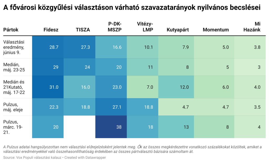 De mi volt a helyzet a települési szintű előrejelzésekkel, amelyekről jó sokszor leírtam és elmondtam a választási kampány során, hogy jobb lenne felhagyni velük, mert megbízhatatlanok (ld. az előválasztások kapcsán itt)? Nos, a fővárosi közgyűlési választásról csak a Medián és a 21 Kutatóközpont posztolt egy közös adatsort röviddel a választások előtt, meg utána a Medián még egyet, de a tanulságok érdekében érdemes melléjük tenni a Pulzus.eu oldalról ismert telefonos alkalmazás használatával gyűjtött, és a sajtóban megjelent/kiszivárgott adatokat is. A Pulzus nyilvánosságra került vizsgálatai mind azelőtt készültek, hogy a TISZA párt indulása bizonyossá vált volna, de az utolsó már felsorolta ezt a választási lehetőséget is. A márciusi (és egy itt fel nem tüntetett, mert csak hiányosan megjelent januári) adatok a Telex-en jelentek meg, a május elejiről pedig Závecz Tibor a sajátjaként számolt be az Infórádió egy adásában, és ennek nyomán közölte a számokat a Magyar Nemzet. Érdemes kiemelni, hogy e kutatások célja a kampánydinamika követése lehetett, és Závecz Tibor a tőle megszokottnál is erősebben hangsúlyozta, hogy adatai csak pillanatfelvételek, nem pedig a várható eredményre vonatkozó előrejelzések.