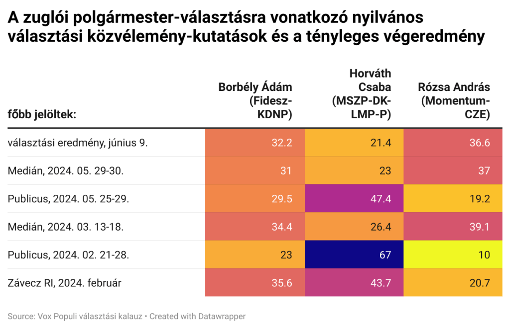 Az amúgy tényleg megbízhatatlan helyi előrejelzéseknek nagy tehát a kelete, de ezekből inkább csak a zuglóiak egynémelyike került nyilvánosságra idén. Feltehetőleg azért, mert itt szuper-izgalmas, az ellenzék között feltehetőleg élénk taktikai fejtörést kiváltó verseny alakult ki a szocialista polgármester Horváth Csaba, a Fidesz jelöltje és a Szikra által is támogatott momentumos alpolgármester között. Ez a verseny pedig felkeltette olyan donorok érdeklődését is, akik különben nem szoktak közvélemény-kutatásokat megrendelni, itt viszont fontosnak érezték a köz tájékoztatását (erről részletesebbben ld. a kommentekben itt).