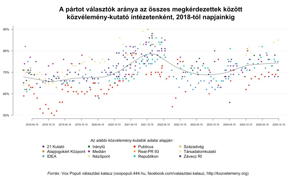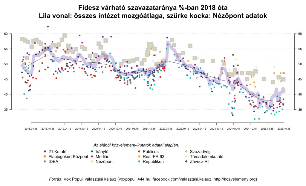 Nézőpont (“XXI. Század Intézet”), országos, 2025. okt. 6-8: itt és itt. (Egy október 14-i tévéinterjúban szerintem a XXI. Század Intézet egyik vezető munkatársa hallgatólag elismerte, hogy a kutatást tokkal-vonóval a Nézőpont Intézet készítette.)
