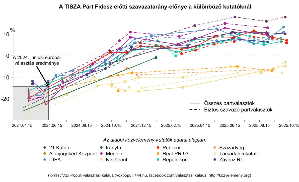 Az október elején készült kutatások megjelenése után az elmúlt hónap összes nyilvános közvélemény-kutatásainak egyszerű átlagolása alapján három százalékos előnyben van a TISZA Párt a Fidesz előtt. Ez az egyszerű átlag sajnos vajmi keveset jelent, mert nyolc pontos Fidesz-előnytől 18 százalékpontos TISZA vezetésig minden előfordul az adatokban. Rövidesen át is váltok ezért egy olyan átlagolásra, ami a megelőző négy választás tapasztalatai alapján súlyozza majd a különböző adatokat aszerint, hogy milyen régiek és melyik intézet posztolta őket: ez a két tényező volt ugyanis az előrejelzési pontosság két legfőbb meghatározója a közelmúlt választásai előtt. Addig is nézzük a színes részleteket.