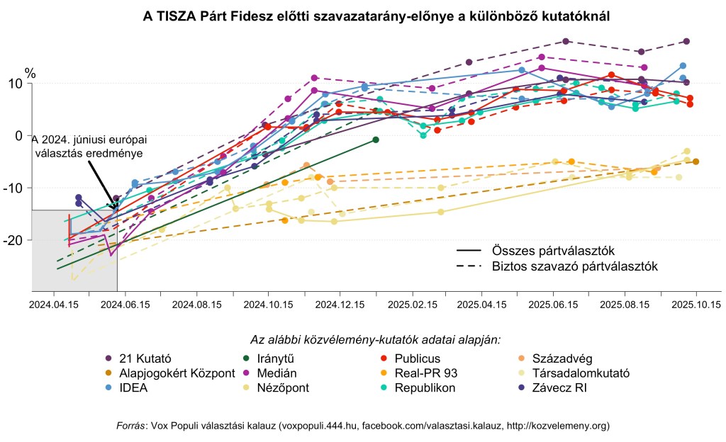 Szerencsére most bárkinek az adatait is nézzük, lényegében ugyanazt a trendet látjuk hónapok óta: nincs és nincs érdemi változás, legfeljebb a két nagy párt hajszálnyival növelgeti a táborát a kisebb pártoktól eltántorodók és a határozatlanok soraiból. Abból is látszik a változatlanság, hogy amikor az egyes intézetek adatait önmagukkal hasonlítjuk össze, akkor néha pont ellentétes trendet látunk az alábbi ábrában, mint fentebb a mozgóátlagoknál. Pl. míg a mozgóátlag szerint október elején egy picit csökkent a TISZA előnye, valójában a két október eleji kutatás egymással egybehangzóan picit növekvő TISZA-előnyt mutatott a két intézet legutóbbi (történetesen mindkét esetben augusztusi) vizsgálatához képest. A csökkenés látszata abból adódott, hogy amikor az október eleji Nézőpont és 21Kutató adatok bekerültek a mozgóátlagba, akkor az augusztus végi Medián, Závecz és IDEA mérések kiestek a figyelembe vett 31 napból, és ez csökkentette a TISZA előnyét a mozgóátlagban, miközben mindkét új vizsgálatban éppenséggel nőtt ugyanazon intézet augusztusi méréséhez képest. Ezért mindig érdemes óvatosan kezelni a mozgóátlag alakulását is. Ezért dolgozom most egy még körültekintőbb megoldás kialakításán.