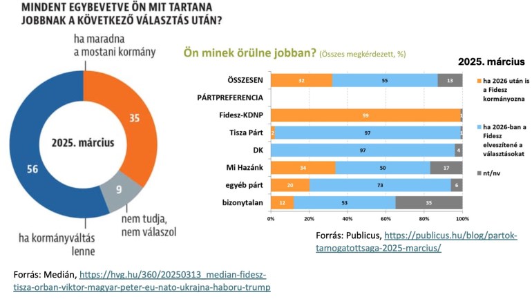 Kiindulhatnánk abból is, hogy a kérdés pontos megfogalmazásától és a kérdező intézet kivoltától függetlenül jelenleg több, mint a választóképes lakosok fele kormányváltást szeretne a következő választáson, és csak harmaduk látná szívesen Orbán Viktor kormányzásának folytatódását (ld. alább az ábra 2025 márciusi adatokat mutat, az elégedetlenek aránya azóta jelentősen csökkent, bár ennek eddig nem nagyon látszott meg a hatása a szavazói preferenciákon). Ilyen szavazatarányok mellett kétségkívül kétharmados többséget kaphatna a mindenki által szabadon megálmodható tartalmú kormányváltás. Ám ennyi és ilyen sokféle ember álmainak (még) egyetlen konkrét ellenzéki alternatíva sem felelt meg, és a TISZA pártot is csak az összes felnőttek harmada támogatja, míg a Fidesz mögé a kutatók nagyobb része szerint negyede, a Fidesz számára legreménykeltőbb Nézőpont-számok szerint pedig közel 40%-a sorakozik fel. Az alapján, hogy a választáskutatási adatokat idén csak “McLaughlin” feliratú álruhában publikáló Századvég mit talált Orbán és Magyar miniszterelnöki alkalmasságáról idén nyáron, alighanem az ő adataik is sokkal rosszabbak a Fidesz szempontjából, mint a Nézőponté. Nem csoda, hogy a magyarok fele nem csak nagy politikai változást tart szükségesnek Magyarországon, de – a fejlett demokráciák állampolgáraitól alapvetően eltérő módon – lehetségesnek is tart egy ilyen “nagy” (vagy éppen “teljes”) politikai változást.