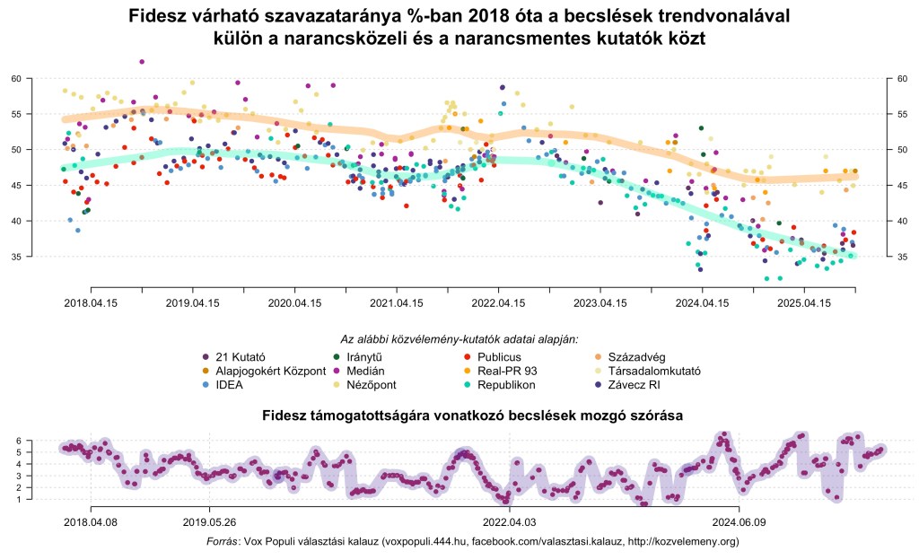 Lévén érdemi változást senki nem mért az elmúlt hónapokban, az összesített eredmény illékonyságának (amit fenti ábrámban a narancsos és a zöld vonal 2025. eleji, valójában csak délibábként értékelhető szánkázása mutat legjobban) nem a politikai széljárás forgandósága az oka. Hanem az, hogy a mozgóátlag aktuális értéke mindig a legutolsó kutatást és azt azt megelőző harminc nap kutatásait összegzi, mivel az utóbbi évek magyar választásai előtt ez bizonyult a legmegbízhatóbb előrejelzési módszernek (erről ld. még alább). Az egyes intézetek pedig nagyon eltérő eredményekkel szolgálnak (ld. alább), és egyre fogyó kivételekkel rendszertelenül publikálnak. Ezért míg 2025 január közepén mért átlagot még a Fidesz számára kedvező decemberi Nézőpont-Századvég-Társadalomkutató adatsorok dominálták, addig január végére már “elavultként” kiestek ezek “az utolsó kutatás középnapja és a megelőző 30 nap” adatainak átlagolásából, és a kormányoldaltól független kutatók adatai, azokon belül is a TISZÁ-n túli baloldalt általában másoknál magasabbra mérő Publicus és Republikon adatai váltak dominánssá hónapokra azért, mert ők gyakran posztolnak adatokat, míg a kormányzati megrendelésre dolgozó intézetek hónapokon át szinte teljesen elhallgattak.