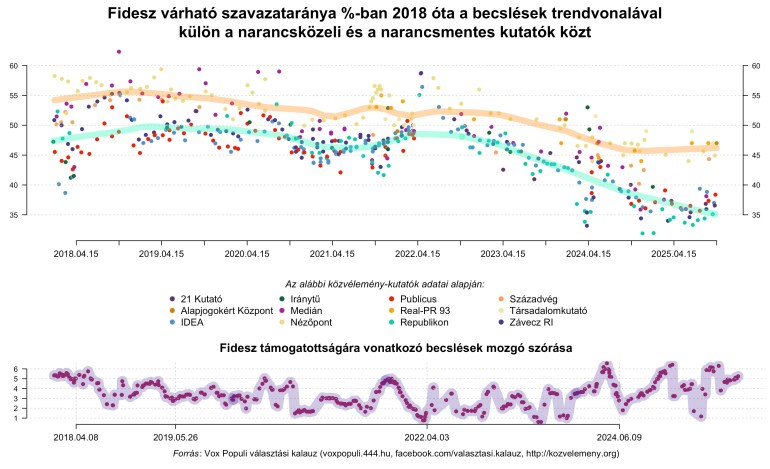 Fontos információt hordoz még a legutóbbi ábra szürke téglalapjainak roppant szélessége (a Fideszre vonatkozó felső sorban pl. nagyjából 32-től 53-ig terjed). Ez az adott pártra vonatkozó intézeti becslések átlagának rendkívül tágas tól-ig hibahatárát,10 tehát a magyarországi közvélemény-kutatási összkép nemzetközileg is kirívó mértékű, és a piac nem piaci szereplők általi telítettségére visszavezethető bizonytalanságát mutatja. Ez meglehetős óvatosságra int az adatok megbízhatóságával kapcsolatban, ami a 2022-es választásokon látott óriási becslési hibákat követő reflexió (elmaradása) fényében jócskán indokolt is.11 Nem egyszerűen módszertani okokra vezethető vissza a nagyfokú bizonytalanság, hiszen – mint az alábbi ábra a Fidesz példáján illusztrálja – hosszú évek óta szinte változatlan nagy különbségek vannak a szinte kizárólag kormánypárt-közeli megrendelésre dolgozó intézetek (Alapjogokért Központ, Nézőpont, Reál-PR 93, Századvég, Társadalomkutató), és az állami megrendelésekből hosszú ideje szinte soha nem részesülő összes többi cég (az ábrában ezeket “narancsmentesnek” hívom) becslései között. A választásokhoz közeledve ugyan rendszerint csökkenek az intézetek közötti különbségek (ld. az alábbi ábra alsó paneljében a kutatási eredmények szórásának időbeli alakulását a függőleges vonalakkal jelzett választások előtti időszakokban), de a két intézet-típus közti különbségek akkor se.