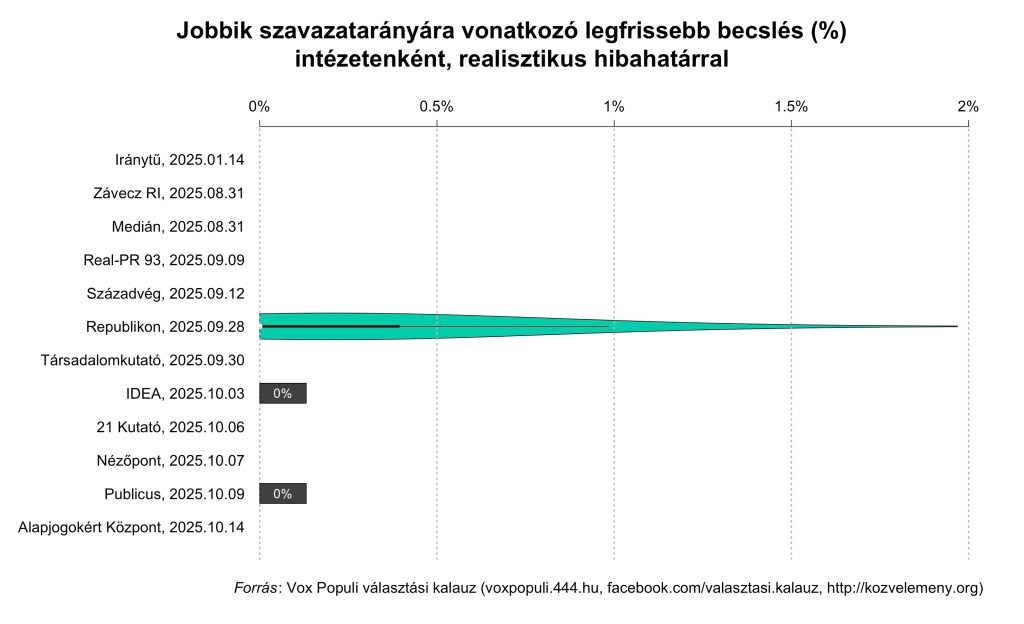 Végül “Vio_[szám][párt nevének rövidítése].jpeg” néven találja meg egy-egy párt támogatottságát a különböző intézetek legfrissebb publikált adatai szerint, azok realisztikus hibahatárával, amit magam számoltam ki a fent már jelzett módon. Itt egy példa illusztrációképpen, ami a Jobbikra vonatkozó legfrissebb becsléseket mutatja (ha egy intézet neve mellett nincs számszerű becslés, akkor ők nem közöltek számszerű becslést a Jobbikra az adott kutatásról szóló posztjukban):