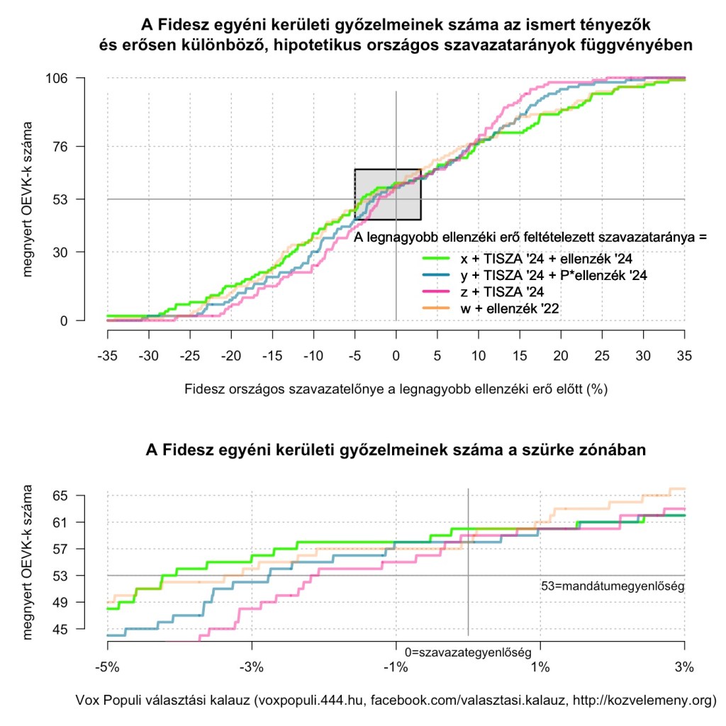 Az x, z, w és y konstansok úgy lettek beállítva a számítások során, hogy azt mutassa meg a becslés, egy a nemzetközi szakirodalomban régóta és általánosan használt, Magyarországon is bevált módszerrel, hogy a Fidesz hány egyéni kerületben győzne, ha országosan 30, 29.9, 29.8, …. -29.8, -29.9, -30%-kal vezetne (az országos szavazatarányok tekintetében) a fő ellenzéki erő előtt, és az adott szín által szimbolizált szavazatföldrajz jönne létre. 30, 29.9, 29..8 stb százalékos fideszes fölénynél, mint az ábra jobb oldalán láthatjuk, az összes színes vonal a plafont veri, tehát mind a 106 egyéni kerületben a Fidesz győzne, még a Vox Populi választási kalauz VI. kerületi otthona táján is, amit 2024 decemberében hozzácsaptak az ország ellenzéki szavazatokban legsűrűbb területéhez meg a lakatlan Margitszigethez. Megfordítva pedig országosan 30%-os Fidesz hátránynál a párt vásárosnaményi, kapuvári, csornai és kiskunfélegyházi erődjei is mind ellenzéki győzelmet konstatálhatnának a választás estéjén. A lényeg persze a két elképzelhetetlen véglet közötti sávban van, azon belül is a szürkével jelölt és az ábra alsó paneljében kinagyított zónában. Nem tudjuk, hogy az ott láthatókhoz hasonlóan szoros lesz-e az országos eredmény 2026-ban. De az egyéni kerületek választási térképének a torzító hatása akkor válik érdekessé, amikor ilyen szoros eredmény születik, hiszen különben csak egy a szavazatarányok által már eldöntött meccsen belül árnyal csak kisebb részleteket.