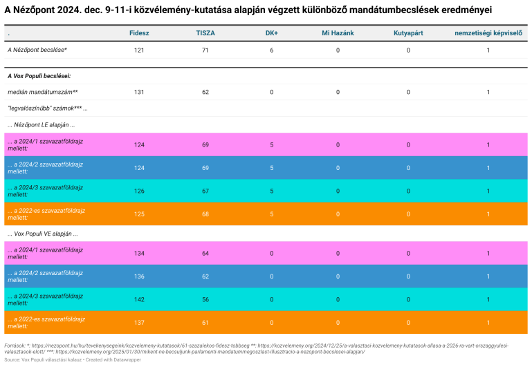 Ennek az az oka, hogy a Nézőpont egy általuk „legvalószínűbb választási eredménynek” mondott számsorból (táblázatomban ezt Nézőpont LE-nek rövidítem, és adott esetben Fidesz=47, TISZA=37, DK=5.0001, Mi Hazánk=4, Kutyapárt=4 belföldi listás szavazatarányt jelent) eredezteti mandátumbecslésének eredményeit. Én viszont évek óta azt a szabályt követem, hogy minden publikált adatsorát figyelembe veszem minden kutatásnak, és azokat átlagolva kapok egy „várható választási eredményt” (táblázatomban ezt Vox Populi VE-nek rövidítem, és adott esetben Fidesz=47.55, TISZA=33.32, DK=4.40, Mi Hazánk=4.53, Kutyapárt=4.03%-os belföldi listás szavazatarányt jelent).