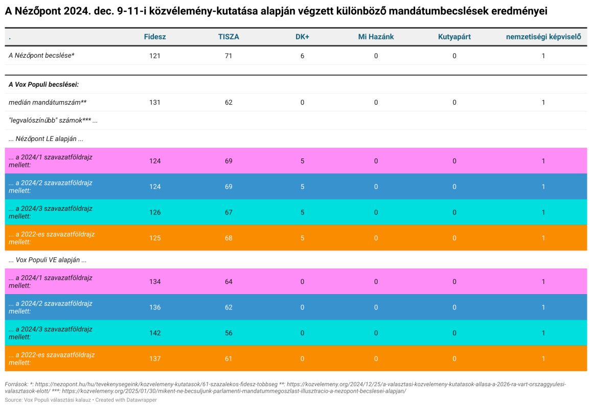 Ennek az az oka, hogy a Nézőpont egy általuk „legvalószínűbb választási eredménynek” mondott számsorból (táblázatomban ezt Nézőpont LE-nek rövidítem, és adott esetben Fidesz=47, TISZA=37, DK=5.0001, Mi Hazánk=4, Kutyapárt=4 belföldi listás szavazatarányt jelent) eredezteti mandátumbecslésének eredményeit. Én viszont évek óta azt a szabályt követem, hogy minden publikált adatsorát figyelembe veszem minden kutatásnak, és azokat átlagolva kapok egy „várható választási eredményt” (táblázatomban ezt Vox Populi VE-nek rövidítem, és adott esetben Fidesz=47.55, TISZA=33.32, DK=4.40, Mi Hazánk=4.53, Kutyapárt=4.03%-os belföldi listás szavazatarányt jelent).