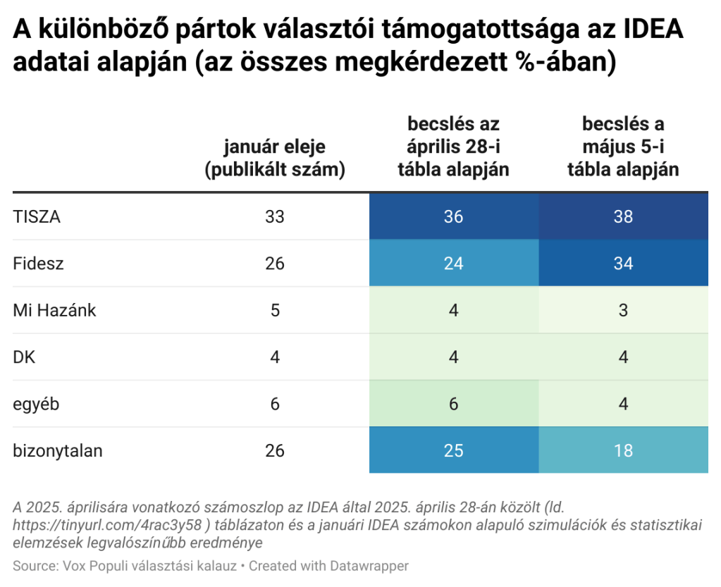 Legalább 95%-os bizonyossággal állíthatjuk, hogy az IDEA áprilisi eleji kutatása minden eddig publikált adatnál nagyobb TISZA vezetést mutat