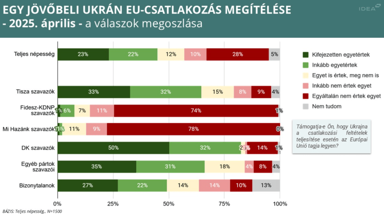 Megdöbbentően nagy arányú TISZA előny rajzolódik ki az IDEA Intézet elvileg publikálatlan április eleji adataiból. Május elsejei ígéretemet követve most megosztom, hogy szerintem mekkora, és hogy mindezt miként számoltam ki abból a táblázatból, amit a választási pártpreferencia adatait január óta nem posztoló kutatóintézet kissé óvatlanul tett közzé április 28-án arról, hogy egyes pártok támogatói, illetve a teljes felnőtt népesség körében mekkora Ukrajna EU-tagságának támogatottsága.